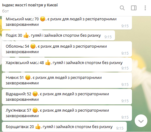 По данным телеграмм-бота "Индекс качества воздуха в Киеве", риск для здоровья наблюдается на Минском массиве, Нивках, Отрадном, Лукьяновке, Святошино, Позняках, Воскресенке.