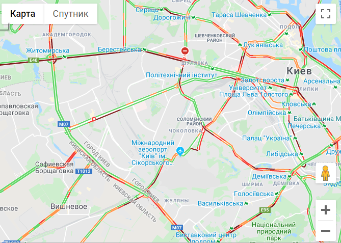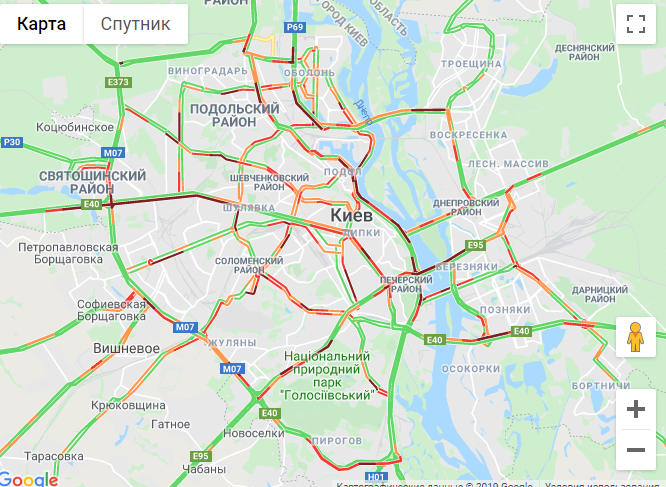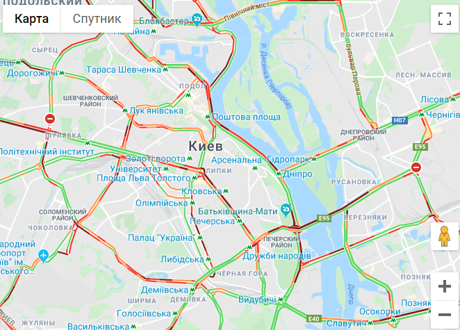 По данным сервиса Google maps, затруднение движения наблюдается в Подольском, Святошинском, Печерском, Соломенском районах, на Липках.