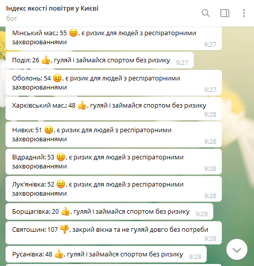 По данным телеграмм-бота "Индекс качества воздуха в Киеве", самыми загрязненными районами являются Святошино и Липки. Здесь рекомендуется закрывать окна и не находится долго на улице.
