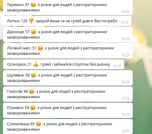 Кроме того, риск для здоровья наблюдается на Минском массиве, Оболони, Нивках, Отрадном, Лукьяновке, Теремках, Дарнице, Лесном массиве, Шулявке, Голоссево, Позняках, Соломенке, Воскресенке.