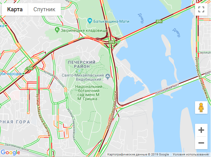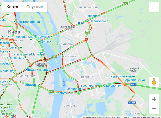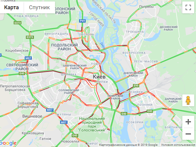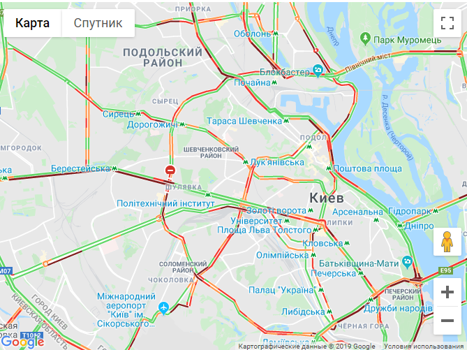 По данным сервиса Google maps, движение затруднено в Печерском, Подольском, Святошинском районах.