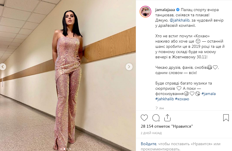 «Палац cпорту вчора танцював, сміявся та плакав! Дякую, @jahkhalib, за чудовий вечір у драйвовій компанії. Хто не встиг почути «Кохаю» наживо або хоче ще — останній шанс зробити це в 2019 році та ще й у повному складі буде на моєму вечері в Жовтневому 30.11! Чекаю друзів, фанів, снобів, одним словом — всіх! Буде справді багато музики та сюрпризів. А поки — фотохизування», — прокомментировала Джамала.