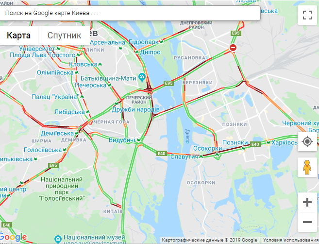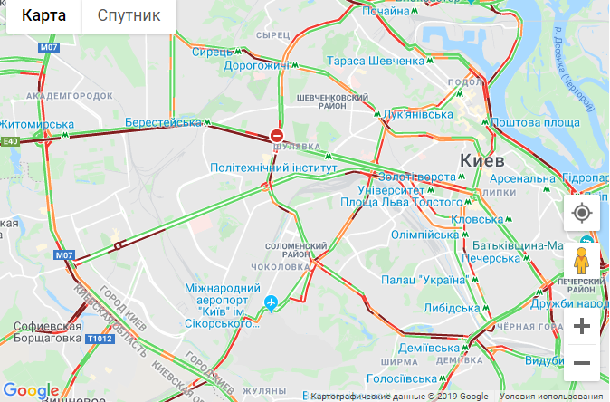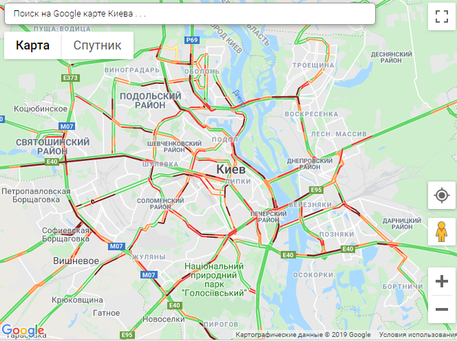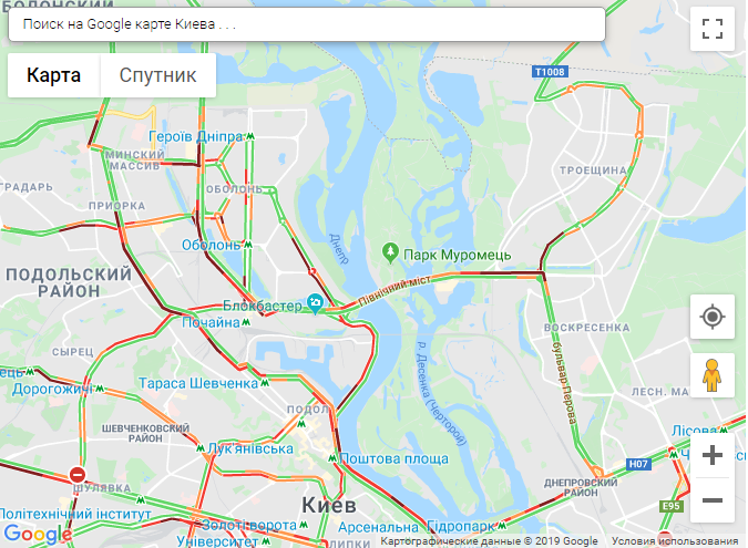 По данным сервиса Google Maps, движение затруднено в Подольском, Святошинском, Печерском районах, на Борщаговке, Оболони, Дружбы народов.