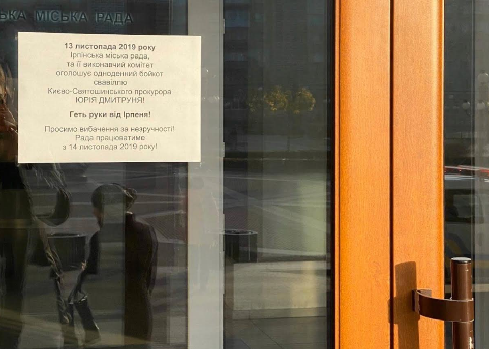 Ирпенский городской совет и исполнительный комитет Ирпенского городского совета объявили о проведении в среду, 13 ноября, однодневного бойкота из-за политического давления со стороны прокурора Киево-Святошинского местной прокуратуры Юрия Дмитруня, передает пресс-служба горсовета в Ирпене.
