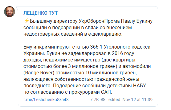 Вместе с тем, экс-нардеп Сергей Лещенко в своем Telegram-канале написал, что речь идет о Павле Букине, который сменил на посту гендиректора "Укроборонпрома" Романова и занимал эту должность с 21 февраля 2018г по 30 августа 2019г.