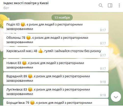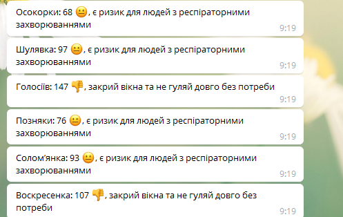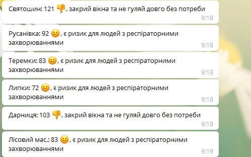 Риск для людей с респираторными заболеваниями наблюдается на Подоле, Оболони, Нивках, Отрадном, Лукьяновке, Борщаговке, Русановке, Теремках, Липках, Лесном массиве, Осокорках, Шулявке, Позняках, Соломенке.