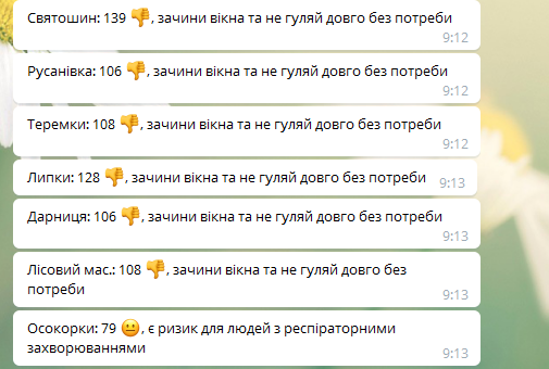 На Нивках, Отрадном, Лукьяновке, Борщаговке, Святошино, Русановке, Теремках, Липках, Дарнице, Лесном массиве, Шулявке, Голосеево, Соломенке, Воскресенке, Минском массиве - воздух существенно загрязнен. Здесь рекомендуется закрывать окна и не гулять долго без необходимости.