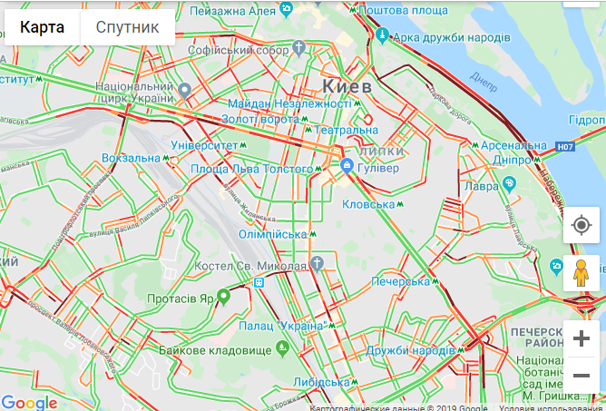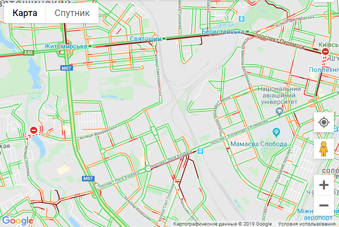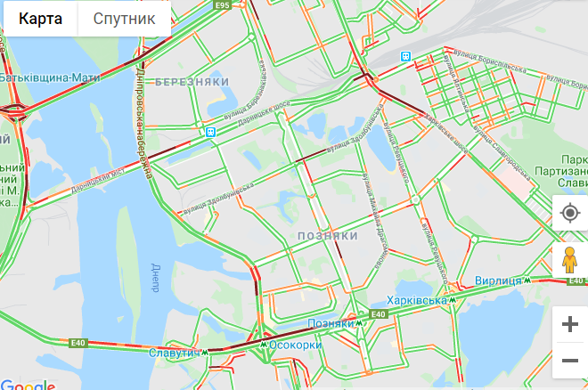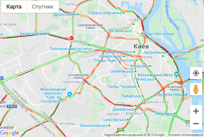 По данным сервиса Google Maps, пробки образовались возле станций метро Святошин, Берестейская, Шулявка, Арсенальная, Осокорки.