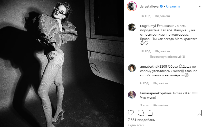 «Где же ваши трусы? Жги, Даша, жги», «Ты всегда была круче всех. Даша. Ты супер», «Без лишних слов. Само совершенство идеальности красоты и сексуальности», «Когда трусы променяла на модные очки», «Эпатажная наша звездочка», — пишут комментаторы.
