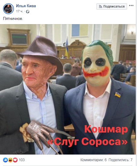На ней помимо самого Кивы в маске "Джокера" можно увидеть украинского олигарха Виктора Медведчука в маске Фредди Крюгера – известного маньяка-убийцы, который является главным отрицательным персонажем серии фильмов ужасов "Кошмар на улице Вязов".