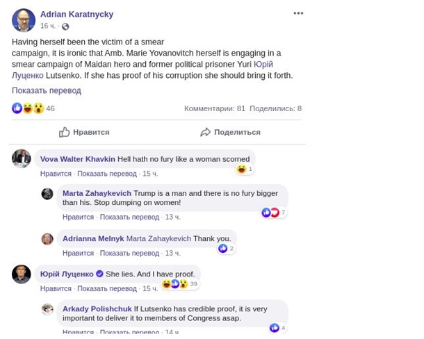 Экс-генпрокурор Украины Юрий Луценко обвинил бывшего посла США в Украине Мари Йованович во лжи после ее заявления в Конгрессе относительно его причастности к коррупционной деятельности.