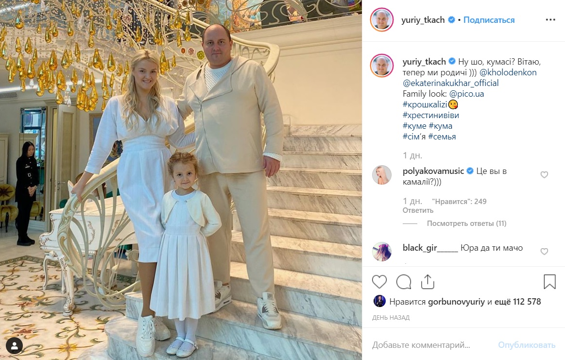 Стоит отметить, что таинство происходило в довольно узком кругу. Гости должны были соблюдать строгий дрес-код из белого цвета или айвори.С программой "Зірковий шлях" Юрий Ткач поделился, какой подарок преподнес крестнице: крестик и серьги с бриллиантами. Кухар передала Вивьен крыжму из белой норки с оберегами, которую презентовали обе пары крестных родителей.
