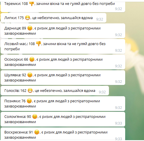 Риск для людей с респираторными заболеваниями наблюдается на Подоле, Оболони, Отрадном, Борщаговке, Русановке, Дарнице, Осокорках, Шулявке, Позняках, Соломенке, Минском массиве.