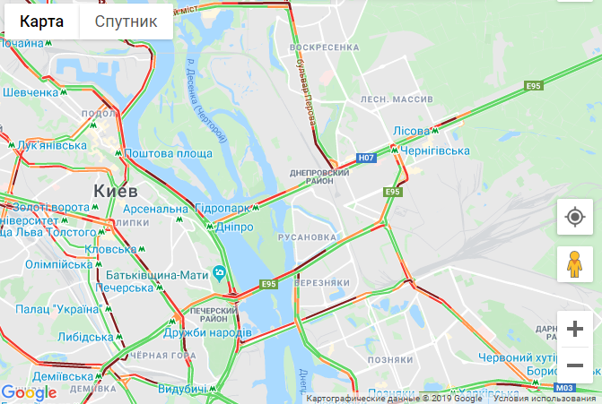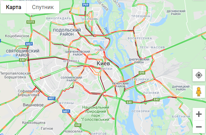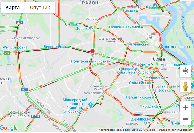 По данным сервиса Google Maps, движение затруднено в Подольском, Святошинском, Печерском, Днепровском районах.