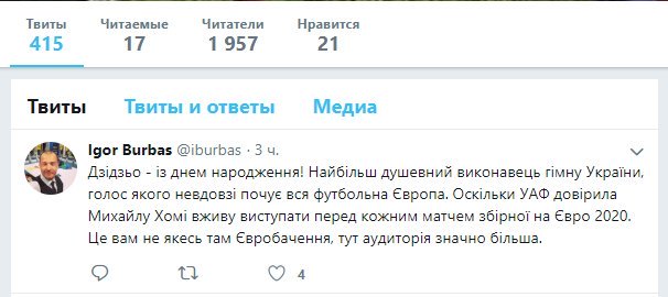 "DZIDZIO – с днем рождения. Наиболее душевный исполнитель гимна Украины, голос которого вскоре услышит вся футбольная Европа. Поскольку УАФ доверила Михаилу Хоме вживую выступать перед каждым матчем сборной на Евро-2020. Это не какое-то Евровидение, тут аудитория значительно большая", – говорится в опубликованном сообщении.