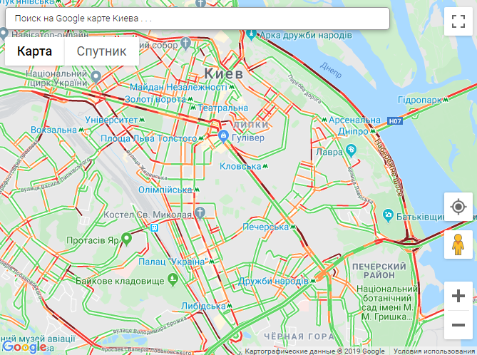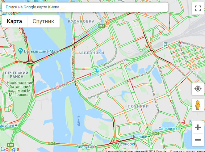 По данным сервиса Google Maps, затруднение движения транспорта наблюдается возле станций метро Святошин, Берестейская, Сырец, Печерская, Осокорки.