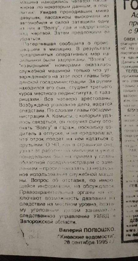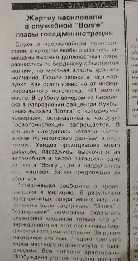 «В машине было четверо – двоим, кажется, по 16 лет и двоим по 19, кажется. Их было четверо, среди них был сын мэра Бердянска (оказалось, что это был сын главы районной администрации — Ред.), фамилию я уже не вспомню. Дело вели запорожские следователи, именно из Запорожья, потому что в Куйбышеве у нас все хотели замять. У меня где-то есть вырезка из газеты, где написано примерно «жертву насиловали в мэрской Волге». Все в Куйбышеве об этом знали, в меня плевали», — рассказала женщина.