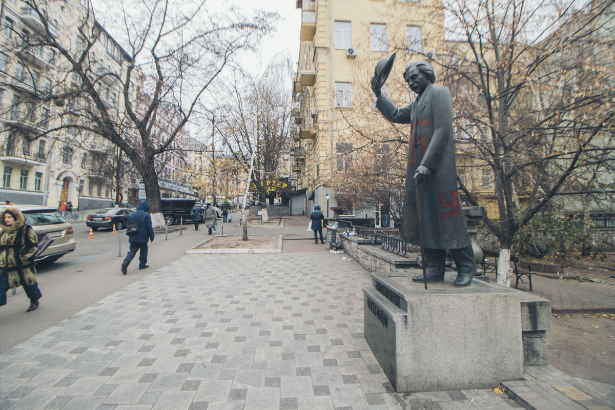 Утром в понедельник, 25 ноября, прохожие стали замечать не очень приятные изменения памятника Шолом-Алейхему, который находится на улице Рогнединской. Ночью неизвестные нарисовали на монументе две большие свастики красного цвета, передает FaceNews.ua.