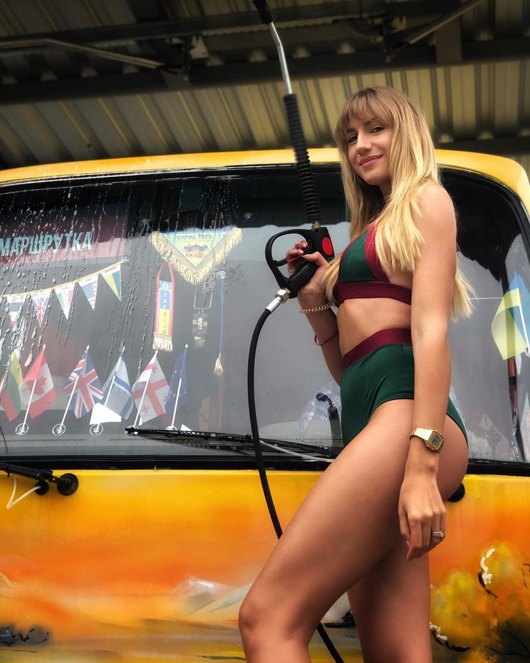 На фото, опубликованном в Instagram, Леся предстала в образе соблазнительной заправщицы и позирует на фоне своей маршрутки в одном лишь купальнике и с топливным пистолетом в руках.