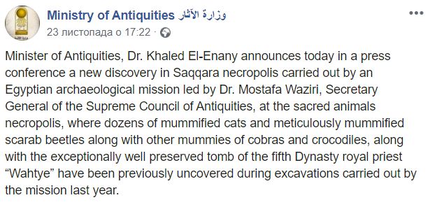 "Исследователи раскопали 75 деревянных и бронзовых статуй, пять мумий льва, 25 деревянных коробок с крышками, украшенными иероглифическими надписями, 73 бронзовых статуэток с изображением бога Осириса, фаянсовые амулеты разных форм и размеров, маски, коллекцию папирусов, украшенных рисунками с изображением богини Таверт", - сообщается на официальной Facebook-странице Egyptian Ministry of Antiquities.