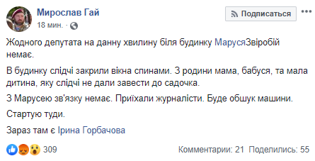 Как пишет в Фейсбук офицер резерва ВСУ Мирослав Гай, во время обысков в доме волонтера закрыли все окна спинами и не дали отвести маленького ребенка в садик. Также он отметил, что сейчас возле дома Зверобой нет ни одного депутата.