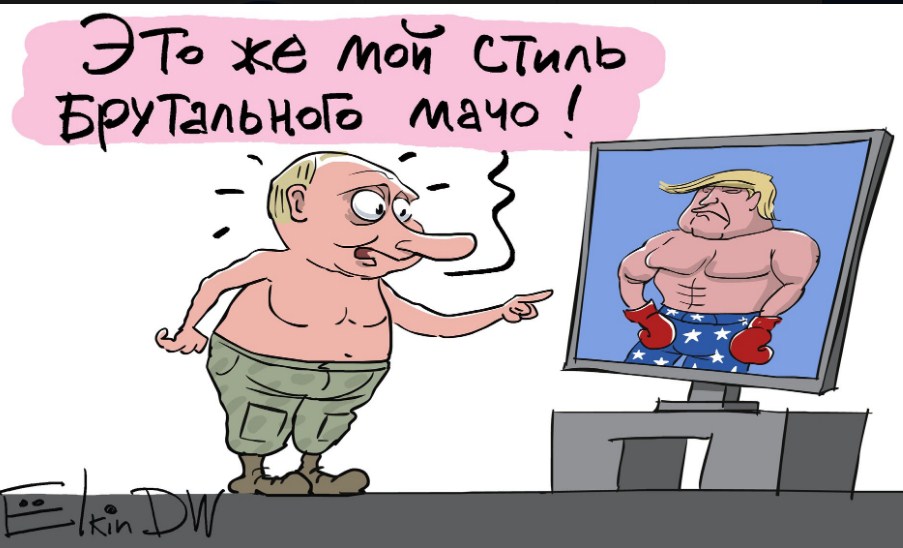 Так, на рисунке изображен голый до пояса глава Кремля, который смотрит на фото человека с лицом Трампа и телом юного Сильвестра Сталлоне и говорит, что это его "стиль брутального мачо".