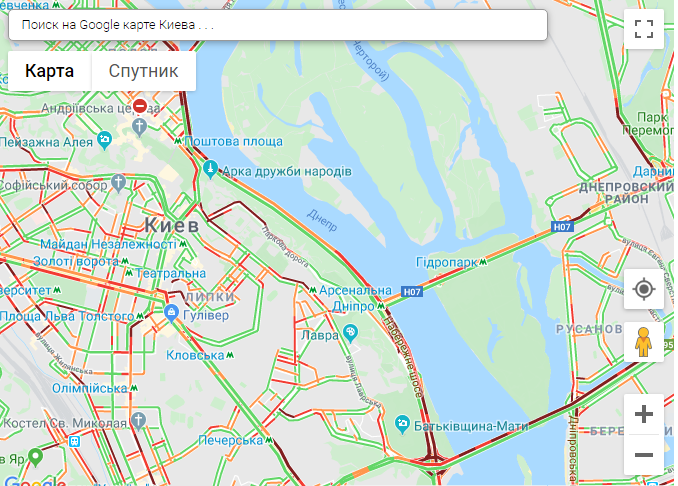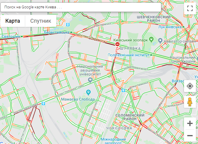 По данным сервиса Google Maps, на правом берегу столицы пробки образовались возле станций метро Святошино. Берестейская, Сырец, Героев Днепра, Дорогожичи.