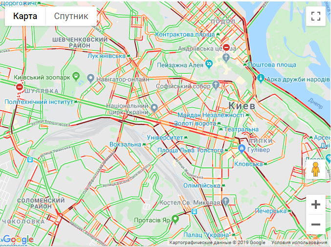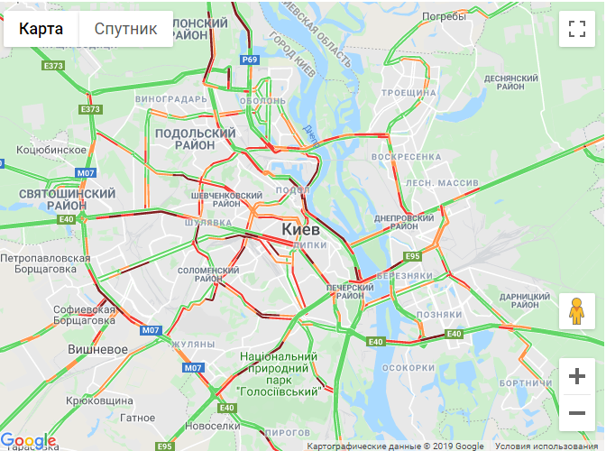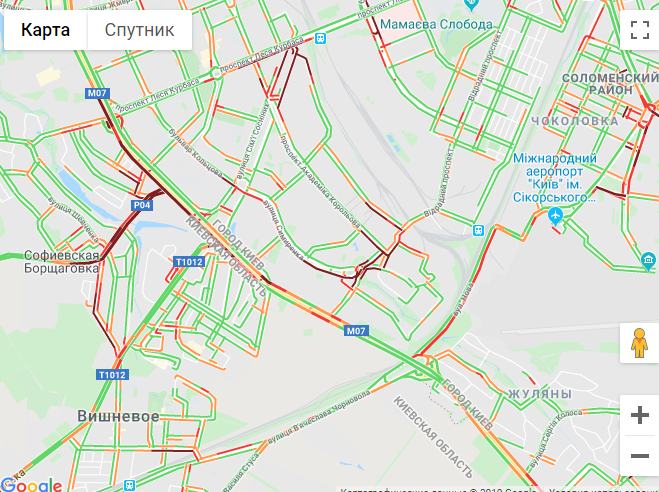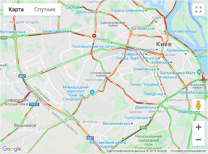 По данным онлайн-сервиса Google Maps, затруднение движения транспорта наблюдается на Софиевской Борщаговке, проспекте Победы, на Голосеевском проспекте, проспекте Леся Курбаса, проспекте Валерия Лобановского, проспекте Академика Глушова, на проспекте Маяковского, проспекте Генерала Ватутина, Кольцевой дороге, улице Вячеслава Черновола, улице Набережно-Крещатицкой, улице Бассейной, Большой Васильковской, бульваре Тараса Шевченко, бульваре Перова, улице Жилянской, улице Саксаганского,