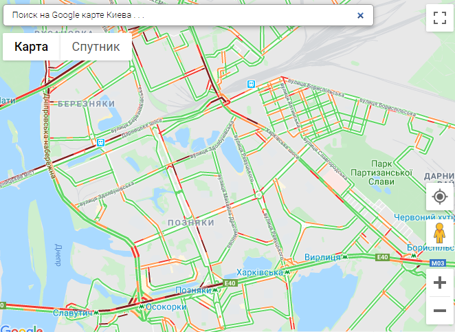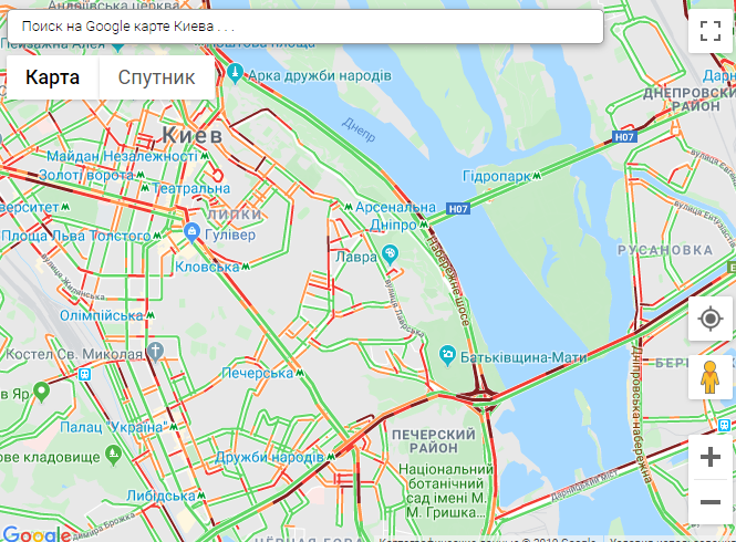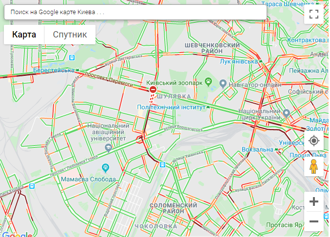 По данным онлайн-сервиса Google Maps, пробки образовались на проспекте Победы, проспекте Леся Курбаса, проспекте Валерия Лобановского, Степана Бандеры, Воздухофлотском проспекте.