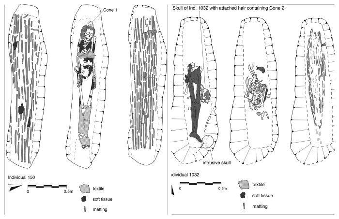 Находка также опровергает гипотезу о том, что конусы заполнялись душистым маслом, который просачивался сквозь них на волосы и тело владельца во время ритуальной практики очищения. Тщательный анализ не обнаружил следов масла и любых других ароматизаторов на головных уборах и волосах погребенных.