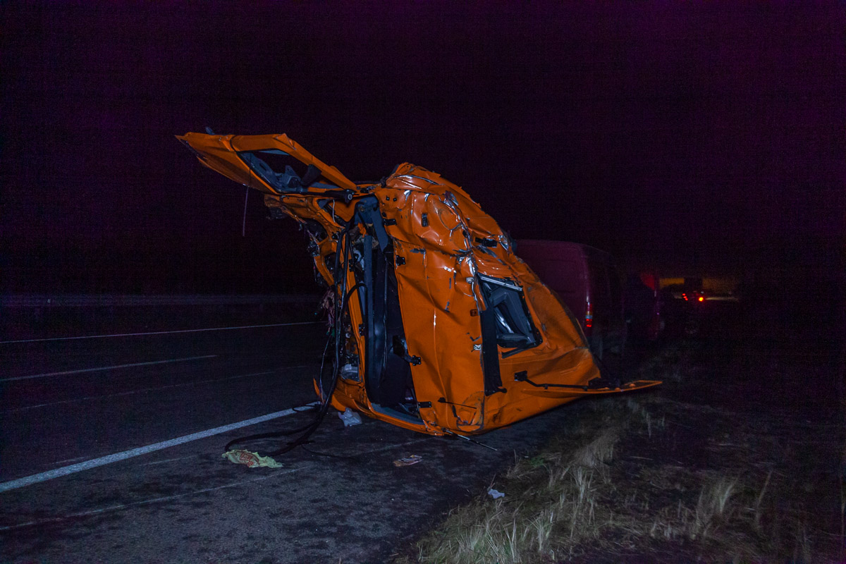Предположительно, участников аварии было двое. Вдоль дороги, возле барьерного ограждения, можно заметить колею. Вполне возможно, что два грузовика "притерлись" во время движения. У второй фуры повреждены колеса и рассыпалась кукуруза.