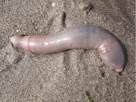После шторма на берег выбросило тысячи пульсирующих так называемых «рыб-пенисов». Их латинское название - Urechis unicinctus. И на самом деле это не рыбы, а вид морских червей.