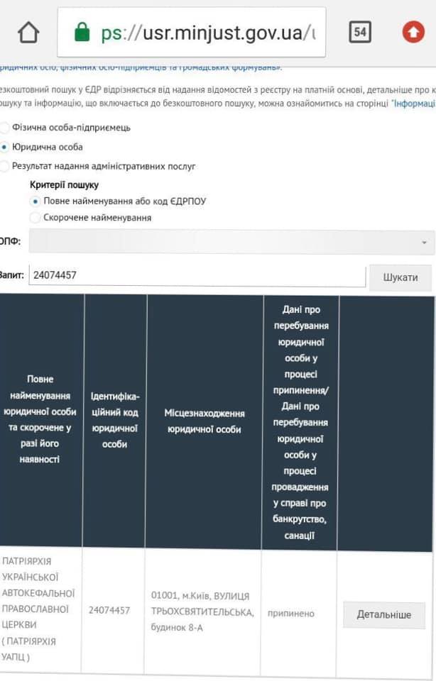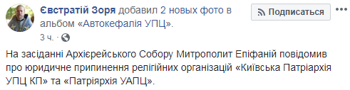 "На заседании Архиерейского Собора Митрополит Епифаний сообщил о юридическом прекращении религиозных организаций "Киевская Патриархия УПЦ КП" и "Патриархии УАПЦ"", - написал он.