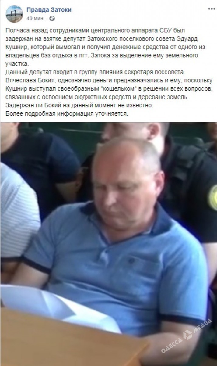 В свою очередь, в группе «Правда Затоки» сообщили, что сегодня сотрудниками центрального аппарата СБУ был задержан на взятке депутат Затокского поселкового совета Эдуард Кушнир, который вымогал и получил денежные средства от одного из владельцев баз отдыха в пгт за выделение ему земельного участка. Связано ли это с поездкой Бокия – пока что неизвестно.