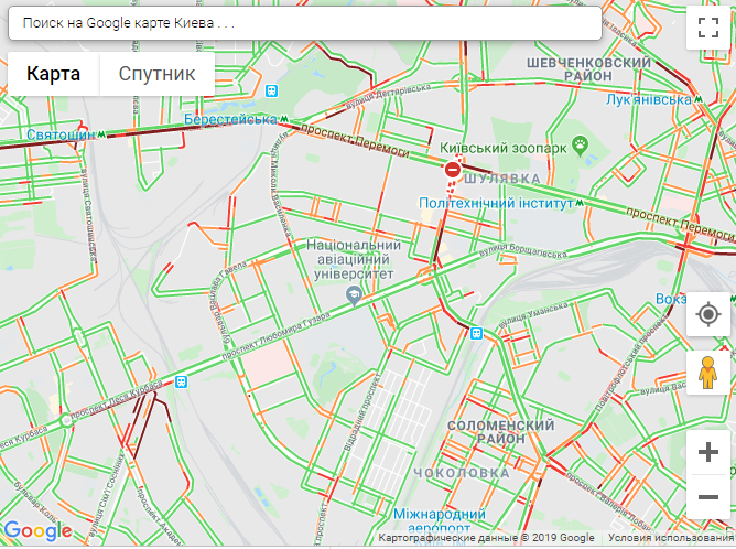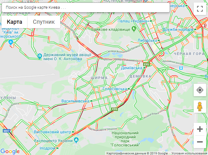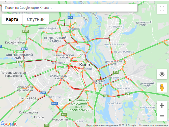 По данным онлайн-сервиса Google Maps, на правом берегу столицы пробки образовались на проспекту Победы, проспекте Леся Курбаса, проспекте Степана Бандеры, ул. Юрия Илленко, ул. Богатырской, ул. Вячеслава Черновола, ул. Большой Васильковской, ул.Маршала Якубовского, ул.Набережно-Рыбальской, ул. Набережно-Крещатицкой, Набережном шоссе.