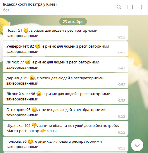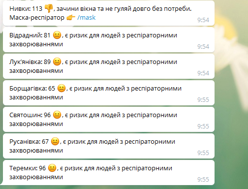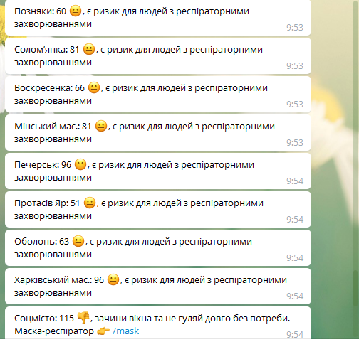По данным телеграмм-бота "Индекс качества воздуха в Киеве", самый загрязненный воздух сегодня на Шулявке, Соцгороде, Нивках. Здесь вообще не рекомендуется выходить на улицу без защитной маски.