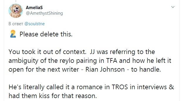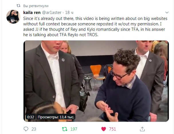 - Это было вырвано из контекста. Джей-Джей имел в виду двусмысленность рейло (сокращенное название пейринга Рей и Кайло Рена) в ПС ( "Пробуждение Силы") и то, что он оставил эту пару не раскрытой (братские или романтические отношения), чтобы следующий сценарист — Райан Джонсон — доработал её. Он буквально в интервью и в СВ ("Скайуокер. Восход") определил её как романтичную, и поцеловались они по этой же причине. Примечание: т.е. за выбор романтической составляющей отвечал Райан Джонсон. Рейло — канон, хорош трясти регалиями, - комментируют ситуацию в фанатском сообществе "Орден Кайло Рена".