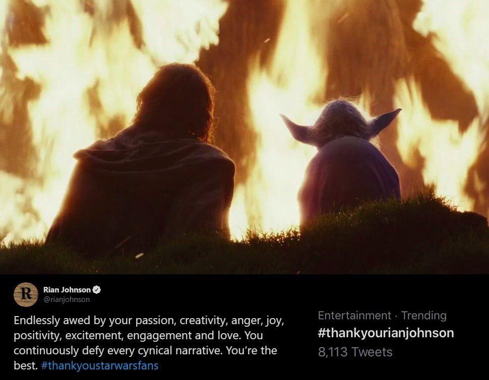 Более того, после выхода фильма «Звездные войны: Скайуокер. Восход» фанаты начали тысячами извиняться в Twitter перед Райаном Джонсоном за критику в его адрес относительно «Звездных войн: Последние джедаи» и даже запустили хештег #thankyourianjohnson.