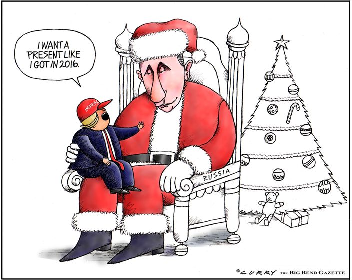 В сети показали свежие карикатуры на президента США Дональда Трампа и президента России Владимира Путина, которых нарядили в традиционные для Нового года костюмы, передает FaceNews.ua.