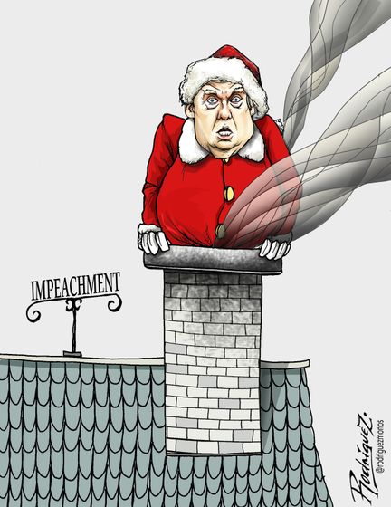 Так, на одной из карикатур можно увидеть Трампа в костюме Деда Мороза, который вылез из домохода. А на крыше установлена табличка с надписью: "Импичмент".