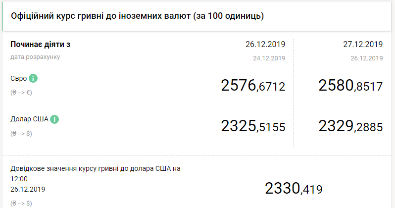 Национальный банк Украины на пятницу, 27 декабря, ослабил гривну на четыре копейки – до 23,29 гривен за доллар. Об этом свидетельствуют данные на сайте регулятора.
