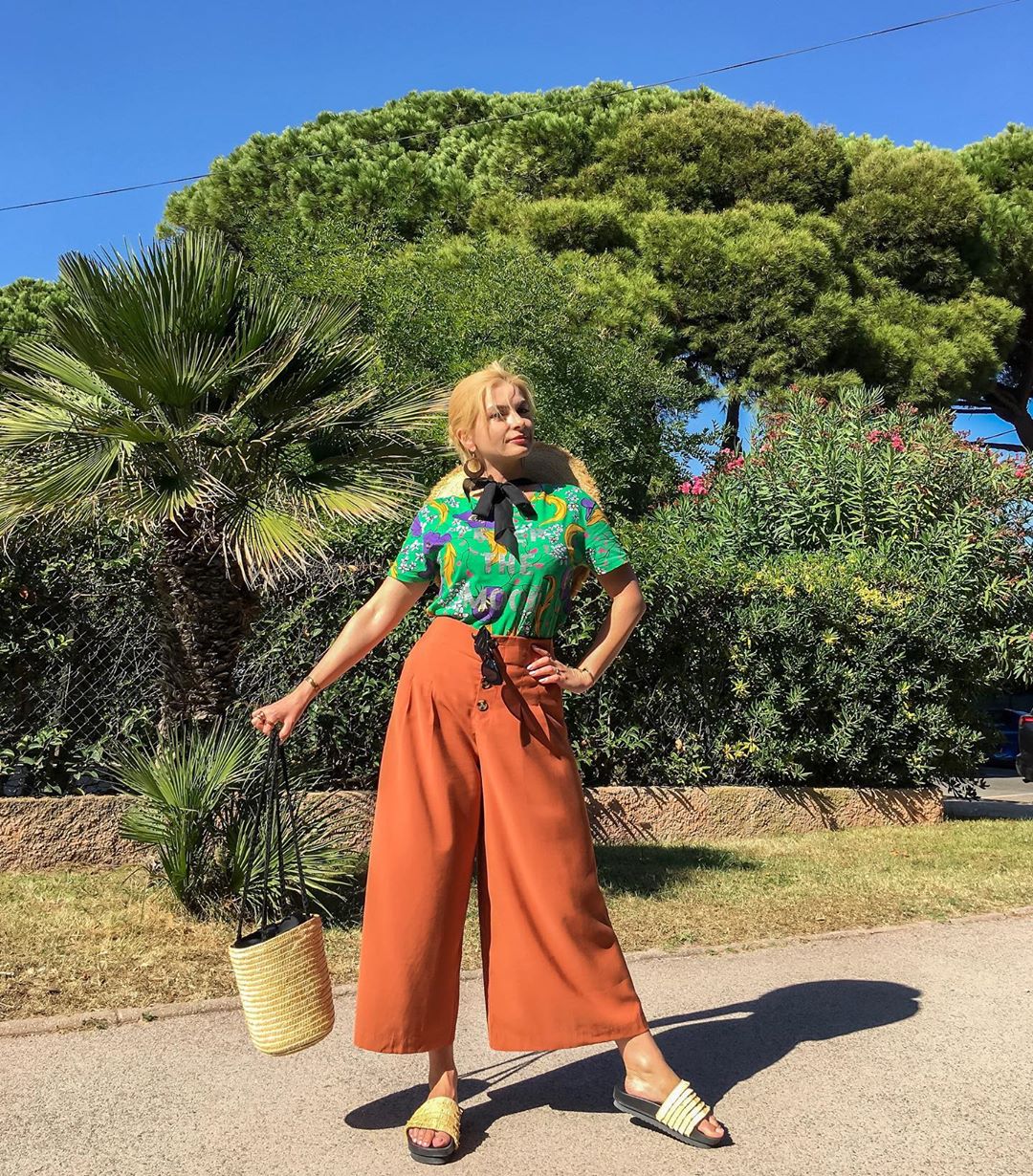 Стильный повседневный образ демонстрирует ведущая «Фактов» Инна Шевченко. Особый восторг вызывает то, как удачно ей удается сочетать яркие цвета в одежде. А еще можно уверенно заявить, что Инна Шевченко всегда на волне моды, о чем в ее образе свидетельствует тренд последних сезонов – кюлоты в сочетании с ярким модным аксессуаром 2019 – плетеной сумкой.
