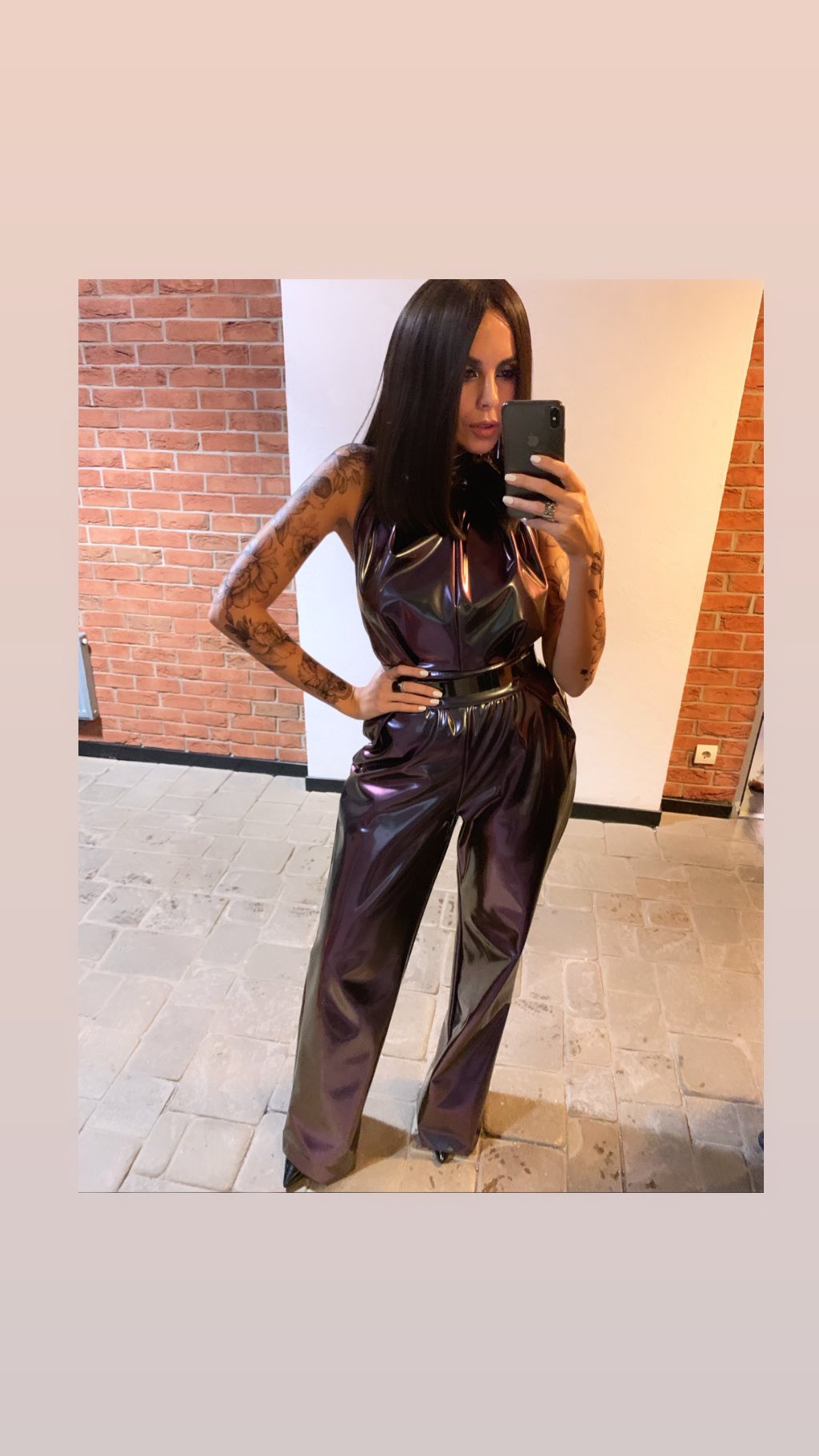 Эффектными кадрами Настя поделилась на своей странице в Instagram. Певица позирует в блестящем латексном комбинезоне черного цвета с поясом, который подчеркнул ее тонкую талию.