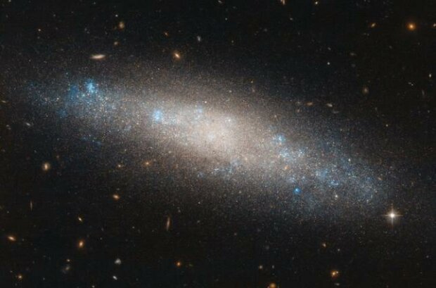 Как можно увидеть по снимку, галактика NGC 4455, которая была зафиксированная телескопом "Хаббл" представляет собой необычно красивое зрелище. Скорее всего, в созвездии находиться очень много холодных звезд, потому что заметно удивительно красивое голубое сияние.
