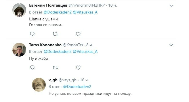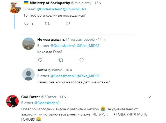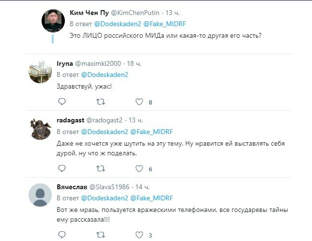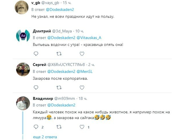 «Это ЛИЦО российского МИДа или какая-то другая его часть?», «Даже не хочется уже шутить на эту тему. Ну нравится ей выставлять себя дурой, ну что ж поделать», «Вот же м**, пользуется вражескими телефонами, все государевы тайны ему рассказала!!!», «Захарова после корпоратива», «Каждый человек похож на какое-нибудь животное, я, например, похож на лемура, а Захарова – на сайгака», «То чтоб рога козлиные помещались?», «Зачем она носит на голове детские штаны?», «Не узнал, не всем праздники идут на пользу», – шутят пользователи.