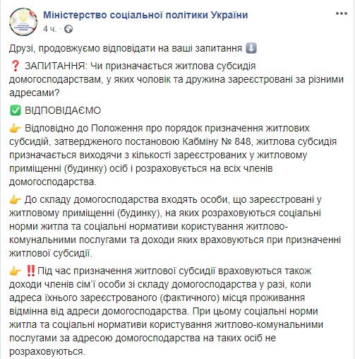 "Жилищная субсидия назначается исходя из количества зарегистрированных в жилом помещении (доме) лиц и рассчитывается на всех членов домохозяйства. В состав домохозяйства входят лица, зарегистрированные в жилом помещении (доме), на которых рассчитываются социальные нормы жилья и социальные нормативы пользования жилищно-коммунальными услугами и доходы которых учитываются при назначении жилищной субсидии", – говорится в сообщении пресс-службы министерства в Facebook.