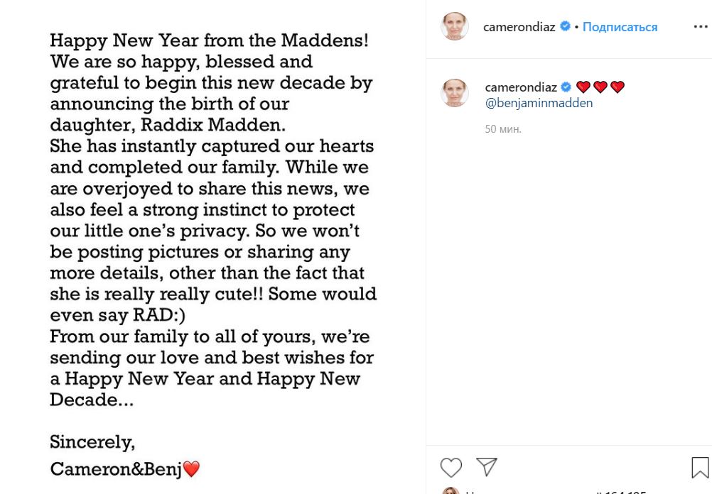 "С Новым годом от Медденов! Мы так счастливы и благодарны, что начали новое десятилетие, объявив о рождении нашей дочери Реддикс Мэдден. Она мгновенно покорила наши сердца и пополнила нашу семью", – сообщила на своей странице в Instagram Камерон Диаз.