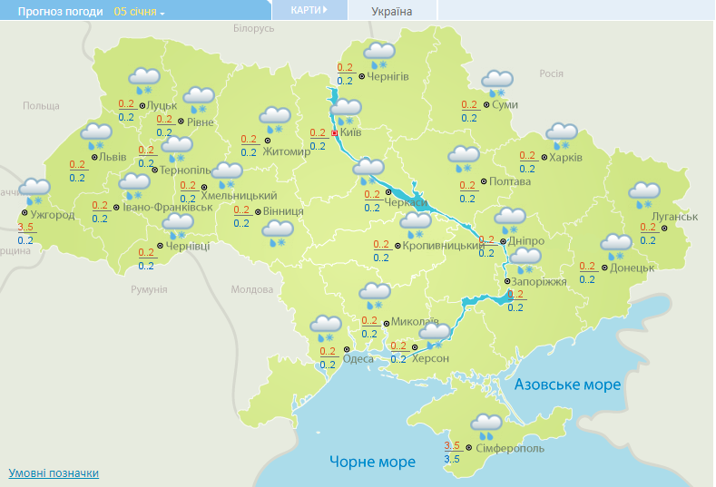 В воскресенье, 5 января, по всей территории Украины днем ожидается плюсовая температура, при этом во всех областях синоптики прогнозируют осадки, передает FaceNews.ua.