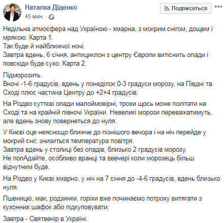 "На Рождество существенные осадки маловероятны, немного что-то может полетать на Востоке и на крайнем севере Украины. Небольшие морозы будут преобладать, но днем опять вернется к нулю", – пишет Диденко.