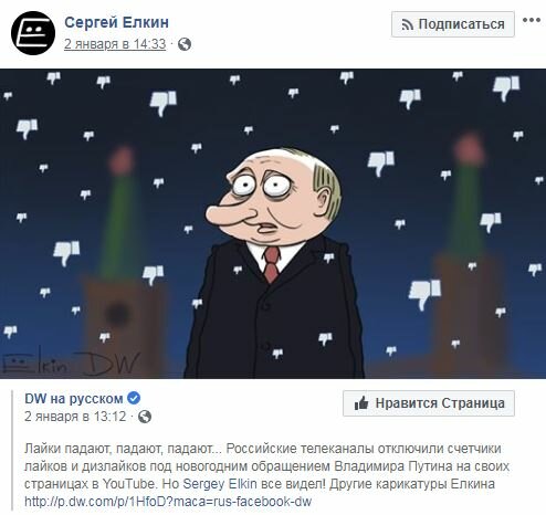 «Лайки падают, падают, падают… Российские телеканалы отключили счетчики лайков и дизлайков под новогодним обращением Владимира Путина на своих страницах в YouTube», — пишут DW на русском в Facebook.